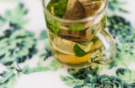 Close up shot of a transparent cup with brewing tea bag in it, lemon and mint