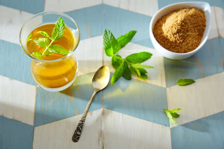Drink for stress, anxiety, chronic fatigue, depression relieving and relaxation. Glass of hot mint tea with cane sugar, traditional Middle East, moroccan, arabic, moorish beverage.