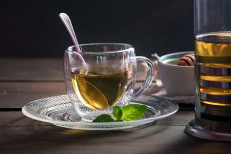 Herbal mint tea cup Transparent glass dark background wooden table still life honey bowl metal kettle teapot spoon cozy