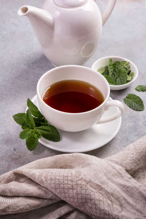 White cup of fragrant tea with kettle and green fresh mint leaves on gray concrete background