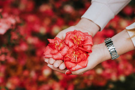 Young girl holding 3 beautiful red camelia flowers wet after the rain