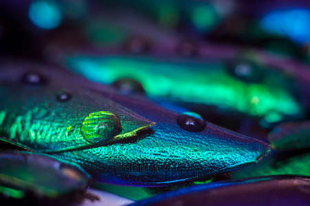 A colorful iridescent beetle rests on a leaf adorned with water droplets, showcasing its vibrant hues in a natural setting. Perfect for nature and insect photography.