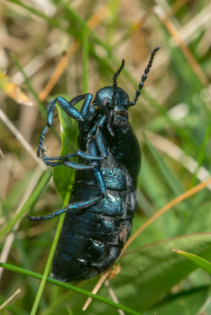 Violet oil beetle, Meloe violaceus feeding on grass, macro photo.