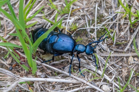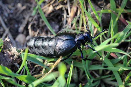 Closeup of violet oil beetle in natural environment. Meloe violaceus