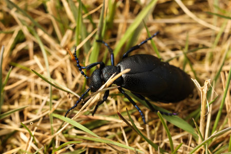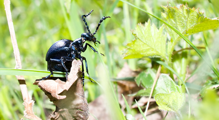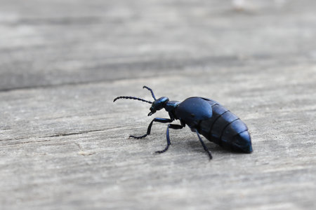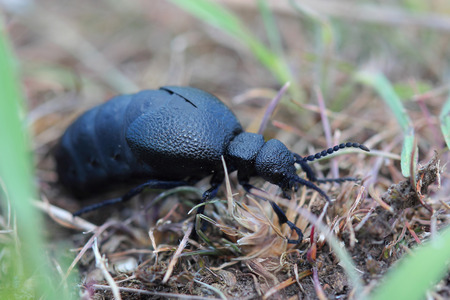 Portrait of a black blue oil beetle. These beetles are poisonous and secrete a toxic yellow substance.