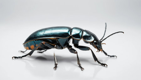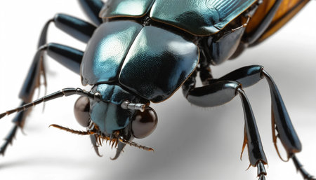 Close up of a black beetle isolated on white background, studio shot ai generated.“This image was created using generative artificial intelligence tools