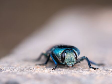 Violet oil beetle (Meloe violaceus) on a gray weathered plank background in spring close up, macro. Parasite of honey bees. Shallow depth of field. Macro. Selective focus.