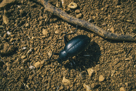 Detail of Meloe proscarabaeus oil beetle, black beetle living in meadows and field margins