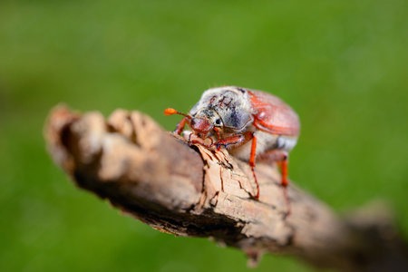 May bug (Melolontha melolontha) is ready to fly from the tree branch, close up. Spring time