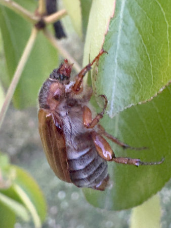 Cockchafer alias May bug (Melolontha Scarabaeidae) hanging on a leaf and eating it.