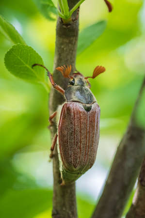 The crunch of the melolontha melolontha insect on a tree branch. animal wildlife background.