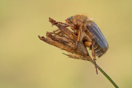 may beetle, an insect with the Latin name Melolontha, sits on a yellow cloth, macro