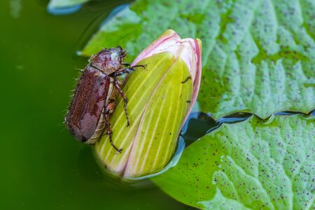 A beautiful European chafer poses on a human hand during a beautiful summer day by the lake