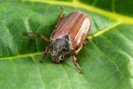 Common cockchafer beetle clings to green leaf in spring garden, illustrating seasonal insect activity, biodiversity presence, and natural life cycle in eco habitat