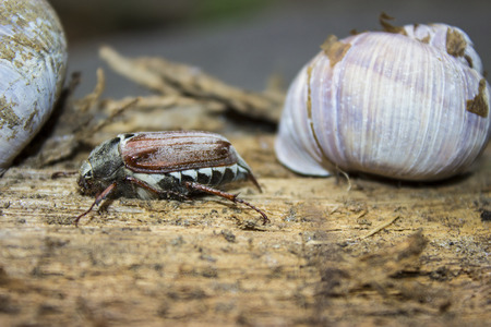 Dead CHRABLE COMMON COCKCHAFER lying on the back on the spring terrace