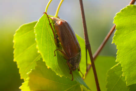 Chafer beetle on a green leaf of a tree. Melolontha eating sheet close-up