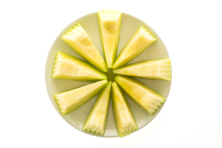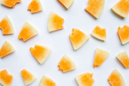 Top view fresh delicious slices melon on white background with copy space. Summer fruit concept