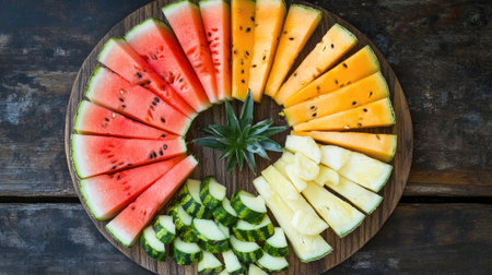 A vibrant arrangement of fresh fruits including watermelon, melon, and pineapple, displayed on a wooden board, perfect for summer gatherings and healthy snacks.