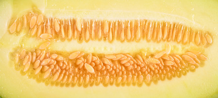 Ripe Galia Melon Half Seeds Exposed, Vivid Yellow Green, Isolated on Vibrant Yellow Background