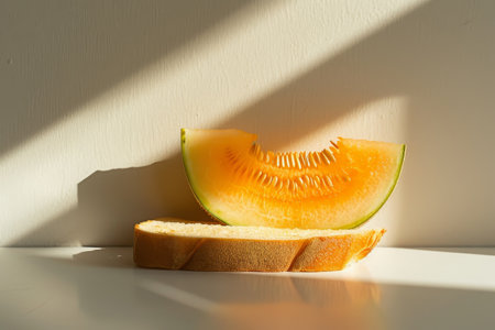 A piece of bread sits next to a slice of watermelon on a minimalist table, A minimalist table with a single piece of toast and a slice of melon