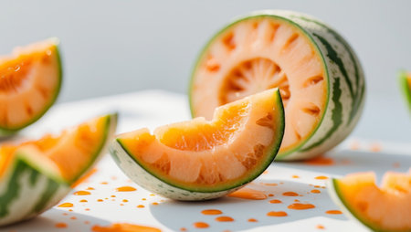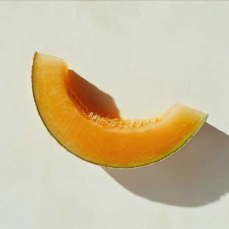Brightly colored cantaloupe slice reveals juicy, sweet flesh with a smooth surface against a soft pastel backdrop, ideal for summer dishes and refreshing snacks