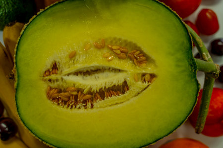 A detailed view of a ripe cantaloupe melon, showcasing its textured rind and juicy orange flesh with seeds. A perfect representation of freshness, nutrition, and the joys of summer fruit.