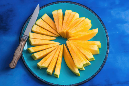 overhead shot of a pile of sliced melon on a plate against a blue background