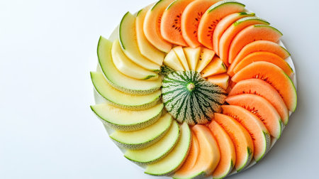 A creative display of cantaloupe and watermelon slices forming a spiral pattern on a white backdrop