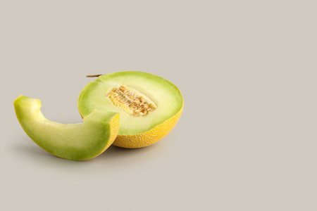 Close-up of melon and its juicy slice on a beige background, vibrant colors