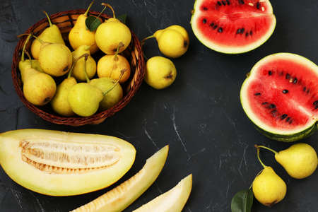 Sliced slices of watermelon and melon, ripe yellow pears against a dark background, horizontal format