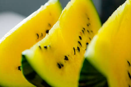 Fresh, bright watermelon slices arranged neatly, showing yellow and pink hues.