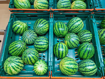 Lots of bright watermelons in supermarket.