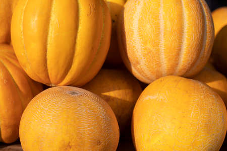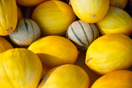 Ripe melons, background for the sale of fruits. Pile with melons