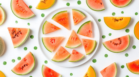 A vibrant arrangement of fresh watermelon and melon slices on a white surface, showcasing their juicy colors, perfect for summer dishes or healthy snacks.