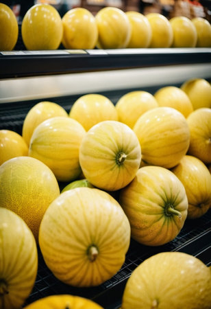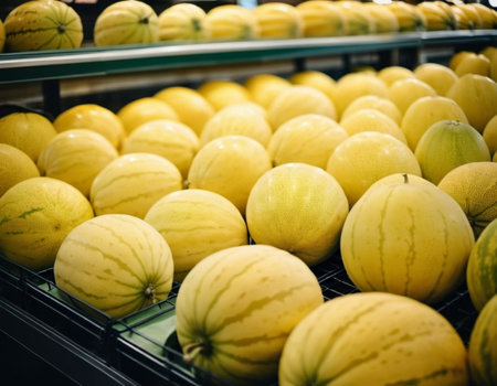 A variety of fresh yellow melons are attractively arranged on supermarket counter, showcasing their bright colors and inviting freshness. Shoppers can easily spot these delicious fruit. Generative AI.
