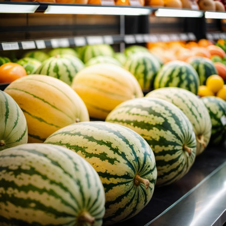 Variety of fresh yellow melons and green watermelons are arranged on supermarket counter, showcasing colors and inviting freshness. Shoppers can easily spot these delicious fruits. Generative AI.