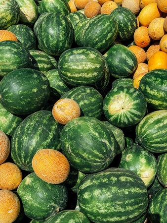 Ripe juicy melons and watermelons on the market in Bodrum, Turkey.