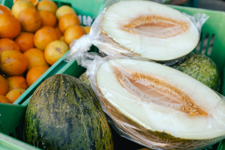Fresh melons at small local urban market. Organic produce on sale at outdoor farmer market. Selling fresh crops and veggies harvest. European urban setting. Close up. Part of the series.