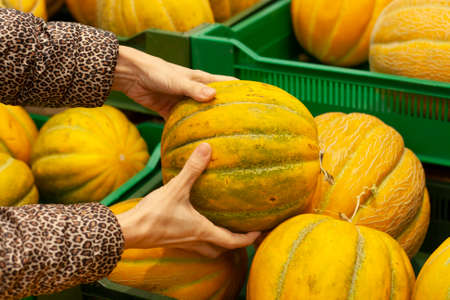 Woman chooses a melon in the supermarket