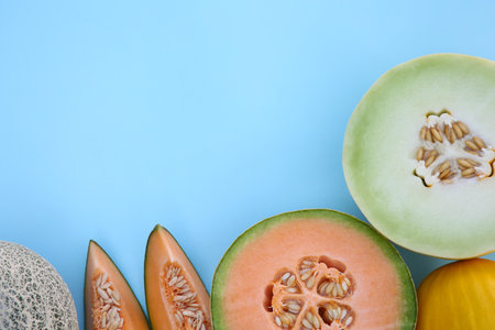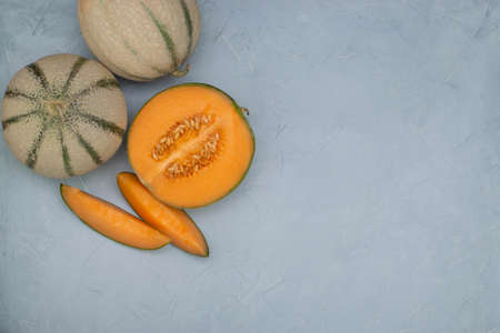 Melons and slices on light blue stone background. Summer concept photo. Copy space.