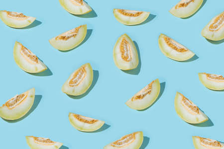 Pattern made with melon against bright blue background.Minimal summer cocnept.
