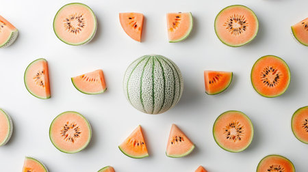 Fruit pattern of melon slices isolated on white background. Top view. Flat lay