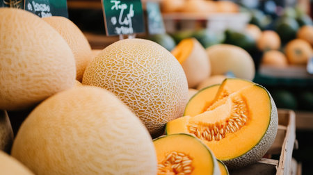 A market display of cantaloupes, with some whole and others cut in half, revealing the fresh, orange flesh and seeds ready for selection.