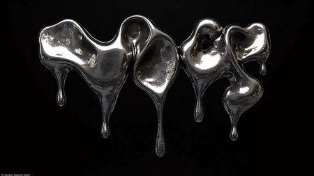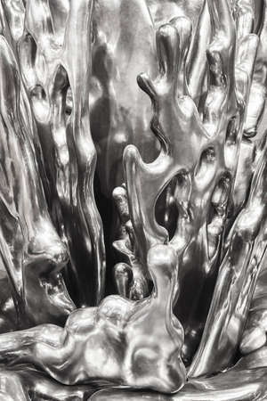 A surreal abstract sculpture formed from molten, reflective liquid metal. The material appears to be dripping and flowing, creating an organic yet metallic form.