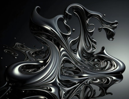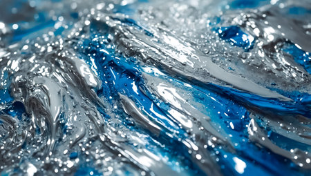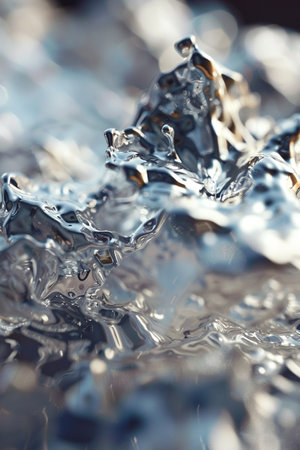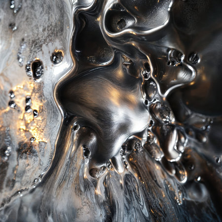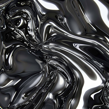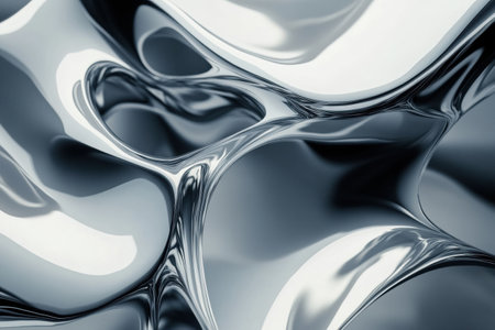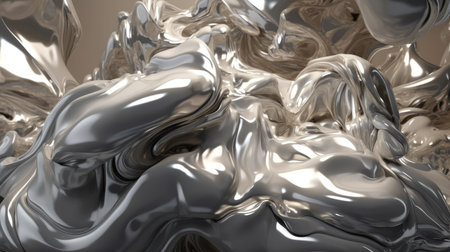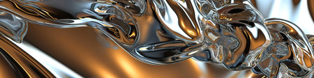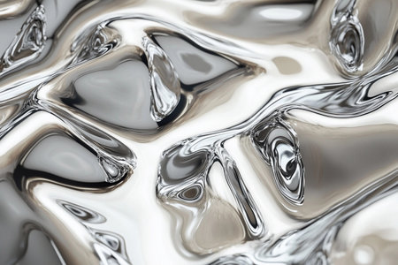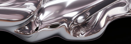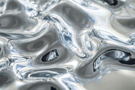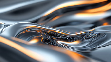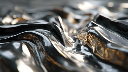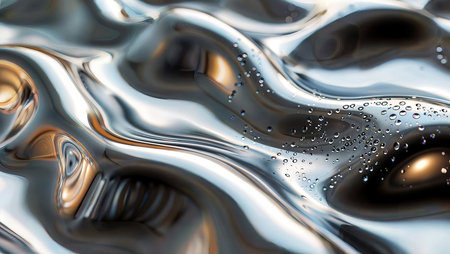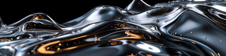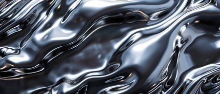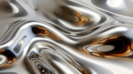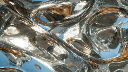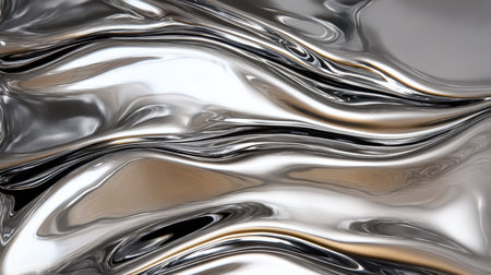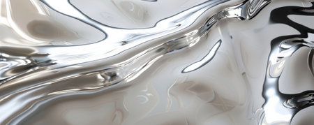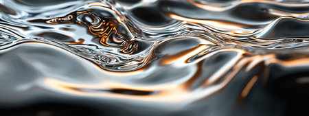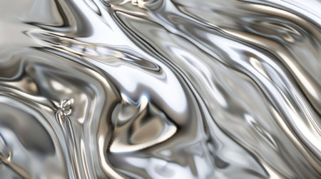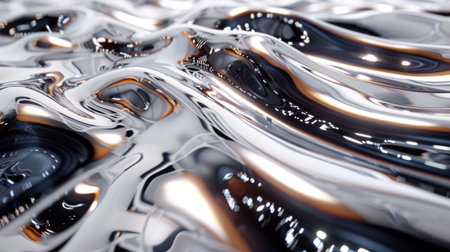 Fluid metallic waves form a captivating abstract background with reflections and highlights, emphasizing the allure of liquid shapes and textures
