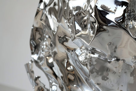 Iridescent Silver Metal Surface Featuring Fluid Reflective Patterns and Sculptural Forms in Chrome