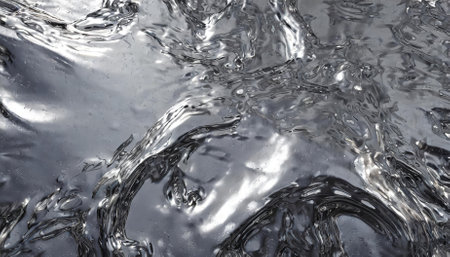 An intricately close-up view of liquid shiny metal in a silver-gray hue, capturing the beauty of flowing textures, radiant highlights, and shimmering details. Ideal for creative projects or visual