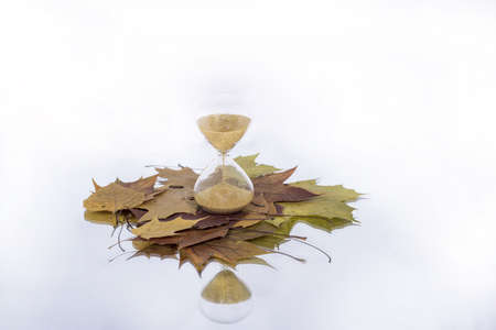 Hourglass stands on a tree in the autumn forest. Close-up. The concept of changing seasons and the transience of time