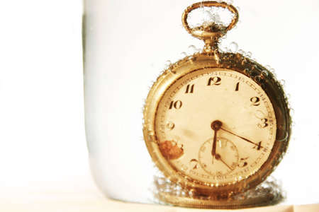 Concept of time. Vintage alarm clock in water with air bubbles. Photo on black background. Space for text. High speed photography.