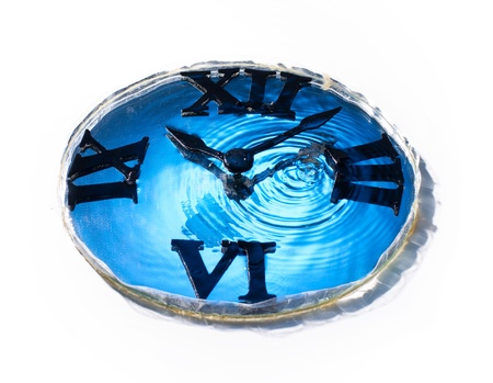 Vintage alarm clock is falling and splashing into water. Concept of time